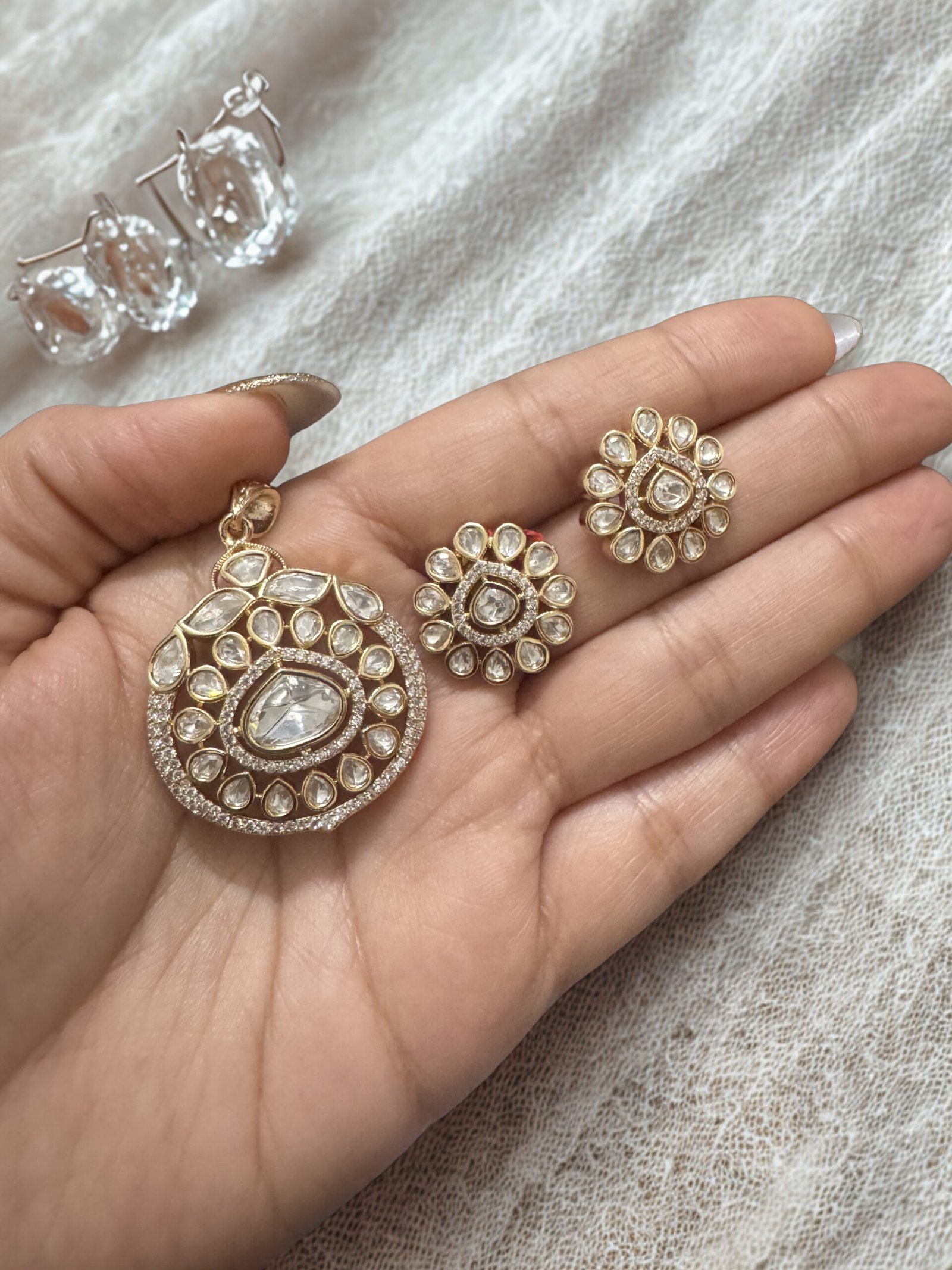 Elegant and timeless, this Polki Pendant Set with Small Studs is designed for subtle festive charm. Featuring classic uncut-style polki stones and delicate matching studs, it’s perfect for both everyday ethnic wear and special occasions.