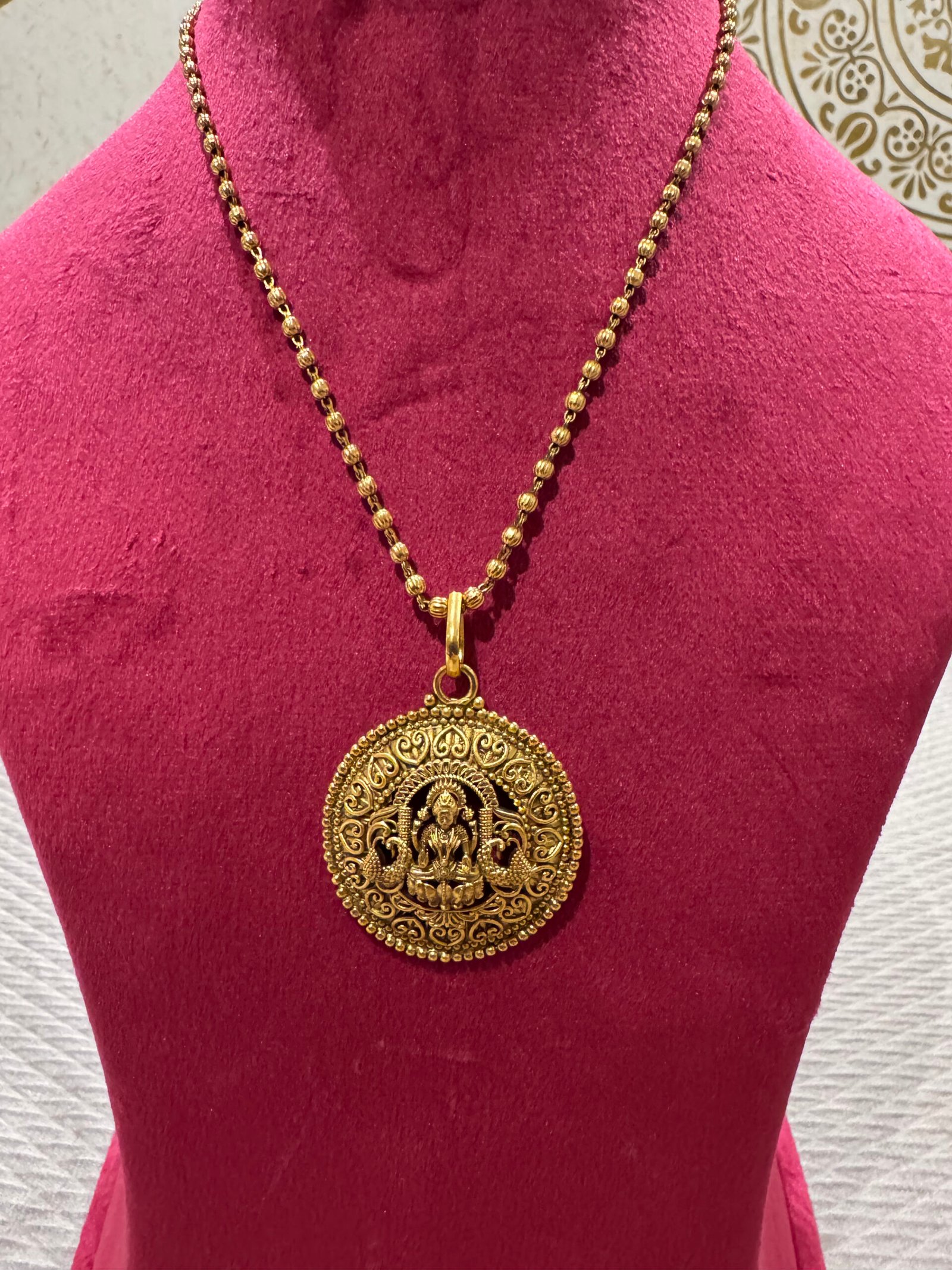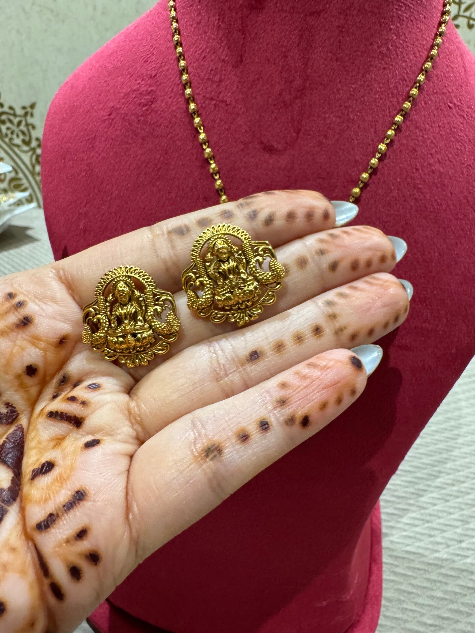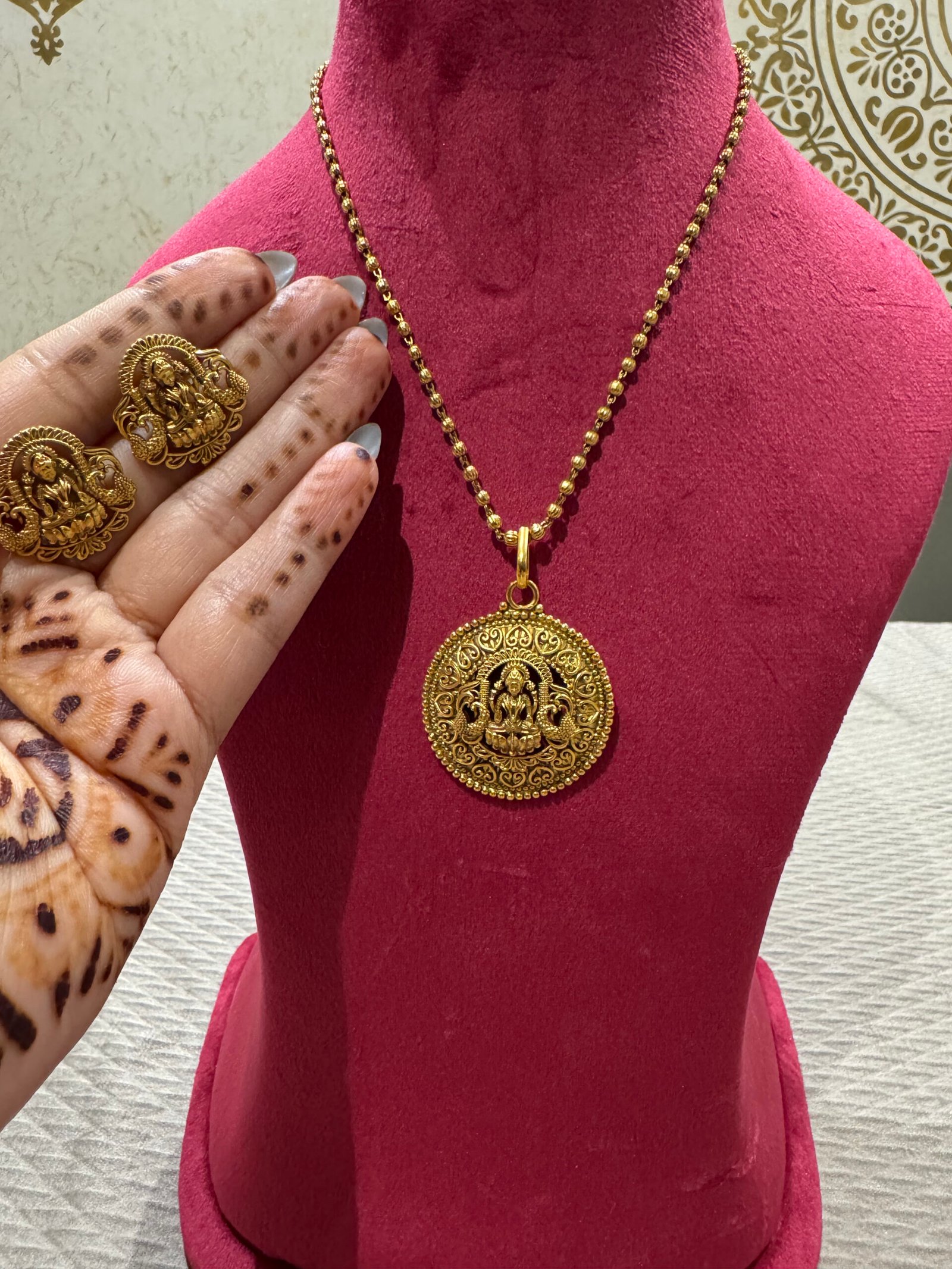 Inspired by traditional South Indian temple jewelry, this Gold Look Temple Pendant Set features intricate detailing and a rich antique finish. Paired with matching earrings, it brings a divine and regal charm to your ethnic look.
